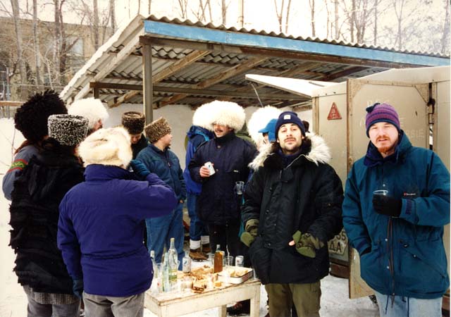 A bit of light relief one day at a barbie organised by the Beeb. Note the obligatory cups of vodka, the food was supplied by a local and was mostly "shashlik", lamb kebabs. You may recognise Jeremy Bowen under one of the silly hats in the middle.
