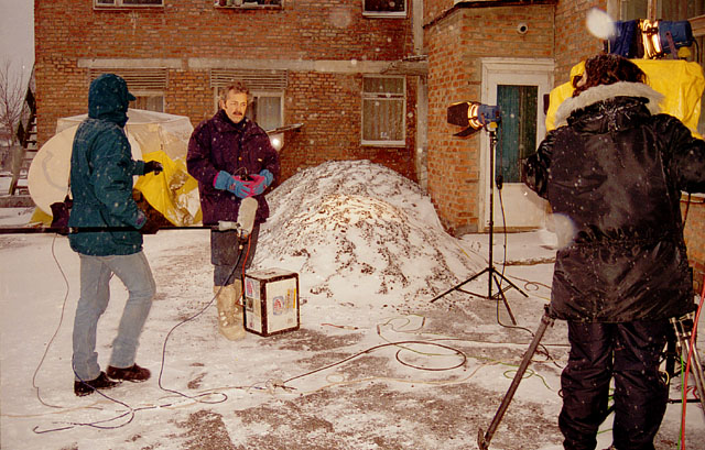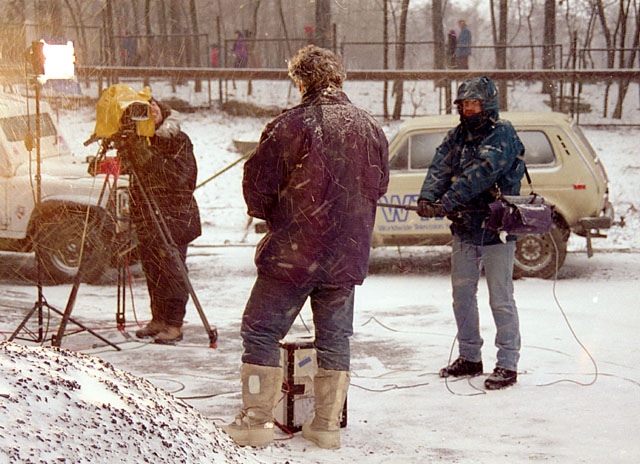 The intrepid Jeremy Bowen seen here outside the Kindergarten reporting the latest. This was one of the cold days, typically going down to -25 or so. On the first live transmission, the soundman went outside with no gloves thinking he'd be ok because we wouldn't be outside for long. It took him some time afterwards to be able to release the microphone pole and straighten his fingers. This picture appeared in the Worldwide TV News magazine.